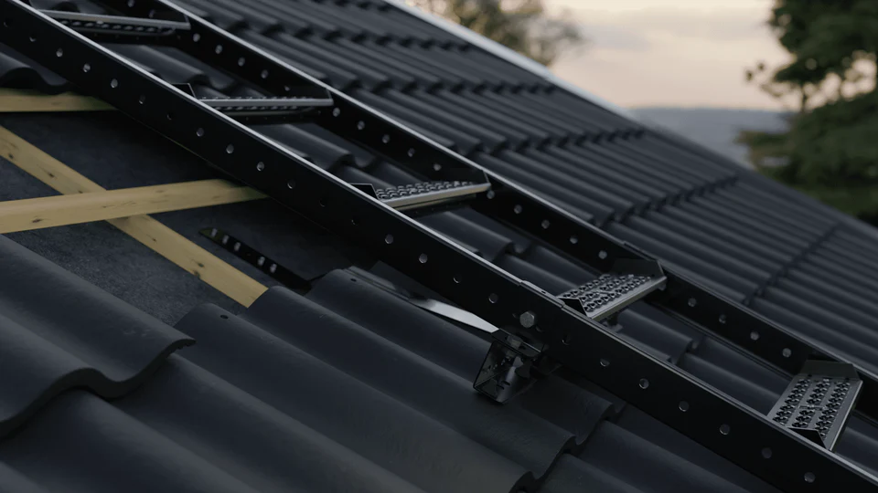 Fast stege för uppstigning på betongpannetak. Monteras i linje och avslutas med förankringspunkt.